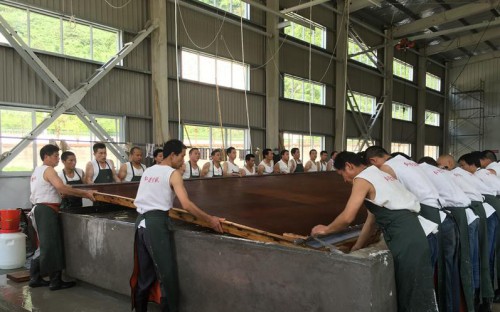 一推、一拉、一蕩……“一二!起!”伴著44名漢子有力的號(hào)子,一張長(zhǎng)11米寬3.3米的世界上最大宣紙的雛形便完成了。