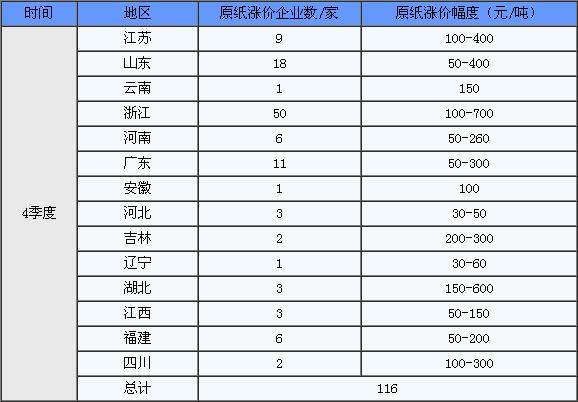 據(jù)不完全統(tǒng)計(jì),第四季度全國(guó)有116家造紙企業(yè)上調(diào)原紙價(jià)格,分別為江蘇、山東、云南、浙江、河南、廣東、安徽、河北、吉林、遼寧、湖北、江西、福建、四川地區(qū),漲價(jià)幅度為50-700元/噸。