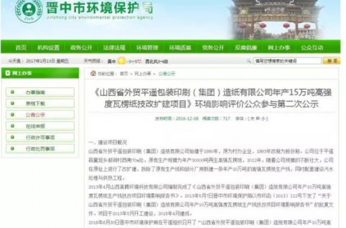據晉中市環境保護局信息,山西省外貿平遙包裝印刷(集團)造紙有限公司在前期調研的基礎上,決定通過改造原有的生產車間,購置4600型造紙機一(臺)套、多臺制漿機及其它輔助設備,擴建一條年后15萬噸高強瓦楞紙生產線,全廠達到年產25萬噸高強瓦楞紙的生產能力,項目總投資15000萬元,目前已經進行進入環境影響評價公眾參與第二次公示階段。