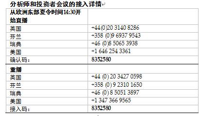 英國時間12點30分、美國東部時間7點30分)進行。會議將由集團首席執行官宋思倫、首席財務官SeppoParvi與高級副總裁兼投資者關系主管UllaPaajanen-Sainio主持。希望提問的分析師與投資者可以參加電話會議(詳情如下)。所有參與者都可以通過網絡收看會議直播。