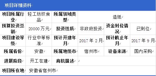 安徽年產(chǎn)10萬(wàn)噸秸稈清潔制漿造紙綜合利用改擴(kuò)建(一期)項(xiàng)目,該項(xiàng)目位于安徽省宿州市。項(xiàng)目一期建設(shè)年產(chǎn)5萬(wàn)噸秸稈清潔制漿生產(chǎn)線。項(xiàng)目總占地面積17.8213公頃;項(xiàng)目建成年產(chǎn)10萬(wàn)噸秸稈清潔制漿生產(chǎn)線,其中3萬(wàn)噸紙漿外售,新建4萬(wàn)噸高檔環(huán)保生活用紙生產(chǎn)線,替代原有東風(fēng)造紙廠3萬(wàn)噸廢紙制漿造紙生產(chǎn)線。項(xiàng)目一期投資20000萬(wàn)元,總投資40000萬(wàn)元。