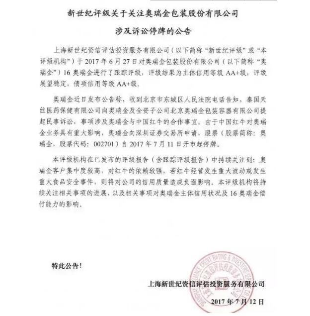 稍早前,奧瑞金還公布了一份新世紀評級對公司涉訴訟停牌的公告: