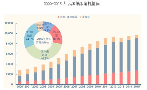 我國(guó)是全球紙漿量消耗最高的國(guó)家,在我國(guó)紙和紙板的生產(chǎn)消費(fèi)仍在穩(wěn)定增長(zhǎng)的情況下,主要造紙?jiān)牧现坏摹垵{,需求十分旺盛。而由于我國(guó)造紙?jiān)辖Y(jié)構(gòu)長(zhǎng)期以非木材纖維為主,木漿及高檔紙漿嚴(yán)重短缺,因此進(jìn)口依賴度較高。從上游消耗紙漿比例來(lái)看,目前我國(guó)是以廢紙漿作為主要造紙?jiān)牧希?015年廢紙漿占比約65%左右,自2000年起廢紙漿已替代非木漿成為行業(yè)主要原料來(lái)源。
