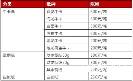 說明:調價執行時間為2017年9月26日-10月10日 東莞玖龍9月提價4次,國慶假期玖龍不發貨、金洲停機,廣東原紙供應或更緊張 9月1日,東莞玖龍紙業宣布所有牛卡、瓦楞紙漲300元/噸,白板紙漲200元/噸,執行時間9月1日至9月10日。 9月10日,東莞玖龍再度上調價格,玖龍、海龍牌牛卡紙漲600元/噸,地龍、地龍再生箱板紙漲500元/噸;50、70克芯紙漲600元/噸,其他克重芯紙漲500元/噸;灰底白板紙漲300元/噸;白面牛卡紙漲500元/噸。(執行時間為9月11日至9月18日);天津玖龍低克重瓦楞紙漲600元/噸,其它箱板紙、瓦楞紙漲500元/噸。太倉玖龍瓦楞紙漲500-600元/噸。 9月18日,東莞玖龍再上調產品價格,其中,優質牛卡紙每噸再漲200元/噸,瓦楞紙/普通牛卡紙每噸再漲100-150元/噸,執行時間為9月19日至9月25日。 9月21日,東莞玖龍本月第四次調價,玖龍牛卡、海龍牛卡、白面牛卡、涂布牛卡紙漲300元/噸;地龍牛卡、地龍再生年卡漲200元/噸;玖龍瓦紙50、70克漲300元/噸,其余瓦紙漲200元/噸;白板紙漲200元/噸。 此外,國慶期間廣東地區的原紙供應可能會比較緊張。除了玖龍宣布10月1日-4日停止發貨4天外,另一規模造紙廠東莞金洲紙業也早就對外發布國慶假期停機檢修通知。按照計劃,該廠將于2017年10月1日-5日期間對電廠鍋爐進行升級改造,期間金洲高強芯紙、H紙、Q紙及銀洲T紙暫停生產。東莞金洲紙業目前總產能超105萬噸。 旺季來臨,原料價格高企,造紙行業將迎全面漲價 造紙行業旺季已經來臨,9月份到年底節日較多,購物潮引發紙品需求增多。廢紙、紙漿等原材料價格居高不下,行業面臨全面漲價。目前,造紙企業基本處于零庫存態勢,下游企業爭相囤貨。 箱板瓦楞紙方面,外廢進口配額緊張,產業鏈庫存處低位,疊加節日需求提前備貨,9月上旬箱板瓦楞紙價格大幅上漲。在外廢配額無新批復額度的情況下,箱板瓦楞紙價格存在來自成本端的支撐;即便出現新一批的外廢增補額度釋放,紙價也難以高位回落。 業內人士表示,年內第二批增補額度數量有限,最多為全年外廢額度的10%,且海外廢紙到岸需1.5-2個月時間。在環保監管趨嚴,旺季需求增加的情況下,四季度箱板瓦楞紙仍將處于供需緊狀態。