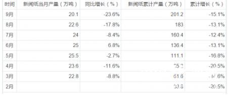 受互聯網的沖擊,新聞紙行業產能和需求均持續下降。由于新聞紙行業整體呈現萎縮態勢,供應方面未來沒有新增產能,但下游需求是報刊(主要是中央、地方政府報刊等)為主,呈剛性,供小于需的良好態勢預計未來將持續,價格的景氣度依然看好。 據前瞻數據庫顯示,2017年9月,中國新聞紙產量20.1萬噸,同比下滑23.6%;2017年1-9月,中國新聞紙行業累計產量201.2萬噸,同比下滑15.1%。以下為2017年1-9月中國新聞紙行業產量數據統計: