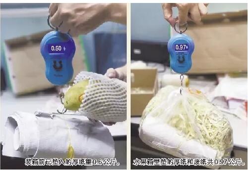 芒果箱里裝著厚厚的碎紙 據(jù)一位常年打掃該市場的環(huán)衛(wèi)工透露,水泥紙箱是從上游批發(fā)商那里直接過來的,但也有些商家會專門聯(lián)系做水泥紙箱的工廠,進行加工定制。隨后,記者找到市場內(nèi)一家廢品收購站。此時,一位中年大姐正在收拾紙箱。記者以要做水果生意的小販身份詢問是否有灌注水泥的紙箱,她告訴記者,以前有一段時間市場里確實有灌注水泥的紙箱。 這位大姐說,市場內(nèi)還會往水果箱里填充很重的廢紙。她說,裝芒果和西瓜的箱子,其中的貓膩就會多一些。她還將收來的廢紙展示給記者看,一疊A4紙大小的白色糙紙,看起來不重,電子秤顯示有足足1斤。 買箱芒果少了1斤多,箱里有約2斤廢紙 記者隨機走進了一家水果店,打開芒果箱,墊在芒果下面的是厚厚的廢紙,隔著廢紙,看不到下面是否還有別的東西。記者表示要買一箱芒果,老板便從開箱的芒果中挑了八個拼成一箱。合箱時,老板又將一疊厚厚的廢紙放在芒果上。 合箱子一稱,重13.15斤。按每斤6元算,一共是78元多,記者講價后以75元買下。隨后,記者詢問為什么要把那疊廢紙放進水果箱。老板說,箱子從上游批發(fā)商那里過來就是這樣裝的。“如果單買芒果,是10元錢一斤,如果買一整箱就算6元錢一斤!彼嬖V記者,裝芒果的紙箱一個要4元錢,可以回收重復(fù)利用。 當晚記者用電子秤重新稱重,發(fā)現(xiàn)比店家稱的少了1.25斤,總重僅為11.9斤。 打開包裝后記者發(fā)現(xiàn):廢紙下面竟還墊著上文所提的厚紙,廢紙和厚紙加起來重1.94斤,紙箱重1.74斤,芒果凈重僅8.22斤——如果按實際單價來算,每斤芒果為9.75元。也就是說,連箱子一起買,盡管才6元一斤,但在不缺斤短兩的前提下,顧客實際要為紙箱和廢紙付22元。 要求商家自律,并增設(shè)公平秤 根據(jù)記者提供的情況,昨日上午,殿前市場監(jiān)督管理所工作人員對中埔水果批發(fā)市場開展了現(xiàn)場排查。記者跟隨前往。 針對網(wǎng)友報料的水泥紙箱問題,工作人員對不同種類的水果箱進行逐一排查,但并未發(fā)現(xiàn)紙箱有異常。對于芒果箱填充廢紙增重的問題,該所副所長張瀟翎說,因為有裝箱和沒裝箱的水果單價不同,消費者可選擇購買,但箱子又不排除是運輸需要進行的包裝,目前要判斷是否涉及消費欺詐證據(jù)不充分。但她也說,這并不意味市場監(jiān)管部門會默許和縱容這種行為,一旦有充足的證據(jù)就會進行行政處罰。張瀟翎表示,殿前市場監(jiān)督管理所會進一步跟進此事的調(diào)查。同時,市場監(jiān)管人員現(xiàn)場還對市場開辦人員提出自律要求。 而針對缺斤少兩的現(xiàn)象,市場開辦人員將在市場的一些路口放置公平秤,提示消費者保證自己的權(quán)益。消費者可以在購買后在公平秤秤,一旦發(fā)現(xiàn)重量不符可以找商家協(xié)商解決。