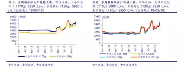 截止5月18日,玖龍、吉安、景興、建暉部分包裝紙報價5000-6350元/噸 申萬宏源5月20日發布了周報。數據顯示,上周(5月14日-18日)箱板紙、瓦楞紙價格仍保持上漲勢頭。箱板紙終端均價為6117元/噸,較前一周上漲5.61%。瓦楞紙終端均價為5364元/噸,較前一周上漲8.06%;业装装寮垉r格繼續上漲,終端均價為5530元/噸,較前一周上漲3.75%。 上周太倉玖龍?170g報價6350元/噸,天津玖龍瓦楞110g報價為5000元/噸,東莞玖龍灰底白板紙終端價格為5650元/噸。吉安銀杉?120g報價5950元/噸,吉安高瓦120g報價5550元/噸。景興紙業高瓦120g報價5550元/噸。東莞建暉紙業灰底白板紙終端價格5410元/噸。(數據截止至5月18日)