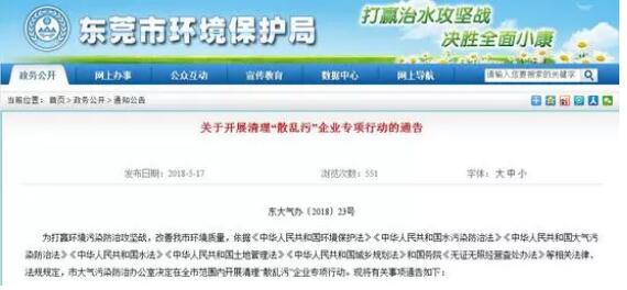 廣東省東莞市以雷霆之勢打響藍天保衛(wèi)戰(zhàn)!全市嚴厲整治“散污亂”企業(yè)!“散亂污”企業(yè)需在2018年5月27日前自行停產!逾期不停產的,斷水、斷電!依法依規(guī)予以取締!并對責任人依法從嚴查處!也就是說,現在這些企業(yè),即將徹底消失在我們的視線里!而散亂污企業(yè),就包括了:印刷包裝、油墨、膠粘劑、廢塑料加工等小型制造加工企業(yè),這些紙箱廠、包裝印刷廠已難逃一劫! 5月17日,東莞市大氣辦發(fā)布《關于開展清理“散亂污”企業(yè)專項行動的通告》(簡稱《通告》)。根據《通告》,全市范圍內將開展清理“散亂污”企業(yè)專項行動。 “散亂污”企業(yè)主要包括但不限于:印刷包裝、油墨、膠粘劑、有機溶劑、有色金屬熔煉加工、橡膠生產、制革、化工、陶瓷燒制、鑄造、絲網加工、軋鋼、耐火材料、碳素生產、石灰窯、磚瓦窯、水泥粉磨站、廢塑料加工、小煉油、玻璃制造、紡織印染、合成纖維制造、表面涂裝、家具、制鞋、汽修、食品加工、石材加工、廢品回收加工、人造板制造、電子元件制造、酸洗磷化等小型制造加工企業(yè);涉及使用涂料、油漆等小型企業(yè)或加工點。