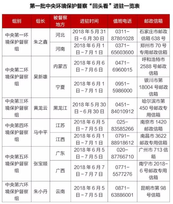 督察范圍:河北、河南,內蒙古、寧夏,黑龍江,江蘇、江西,廣東、廣西,云南等省(自治區); 督察組組長:已組建6個中央環境保護督察組,組長由朱之鑫、吳新雄、黃龍云、馬中平、張寶順、朱小丹等同志擔任,副組長由生態環境部副部長黃潤秋、翟青、趙英民、劉華等同志擔任。各督察組具體如下: 第一組:河北、河南,組長朱之鑫,副組長趙英民; 第二組:內蒙古、寧夏,組長吳新雄,副組長翟青; 第三組:黑龍江,組長黃龍云,副組長黃潤秋; 第四組:江蘇、江西,組長馬中平,副組長劉華; 第五組:廣東、廣西,組長張寶順,副組長翟青; 第六組:云南,組長朱小丹,副組長黃潤秋。