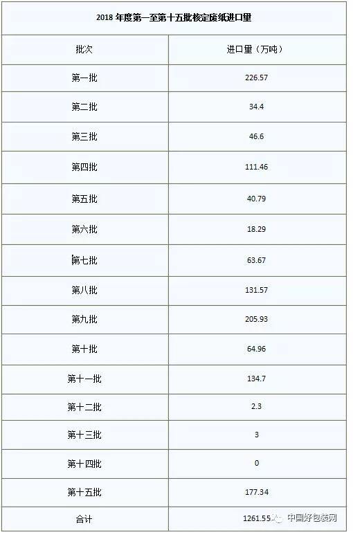 截止目標,2018年一共審批了十五批建議批準的限制進口類申請明細表,總核定廢紙進口量為1261.55萬噸。具體如下: