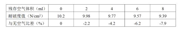 通過實驗表明,油缸中殘存空氣量對耐破度值的影響如下表: