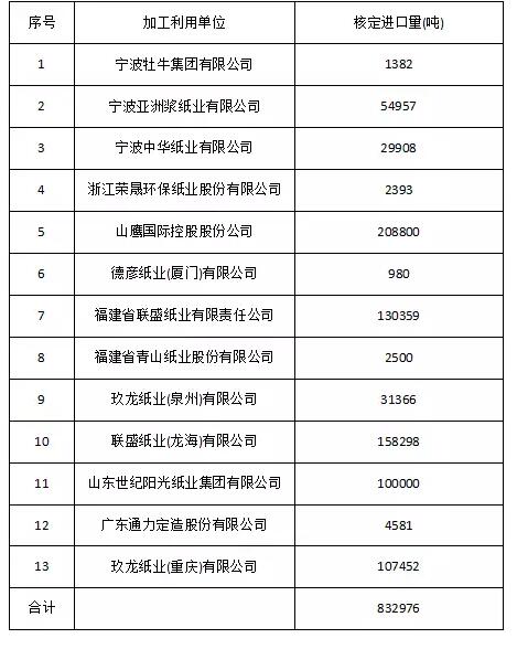 1家新紙廠獲得核準(zhǔn)量,目前共有67家紙廠獲批廢紙進(jìn)口許可 值得一提的是,在本批廢紙進(jìn)口許可名單中,出現(xiàn)了兩家新紙廠,即廣東通力定造股份有限公司和寧波牡牛集團(tuán)有限公司。自4月份以后就沒(méi)有新紙廠獲得核準(zhǔn)量,而本次新紙廠的出現(xiàn),則意味著將有更多符合條件的紙廠申請(qǐng)廢紙?jiān)S可成功。 據(jù)統(tǒng)計(jì),截止目前,已有67家紙廠獲得廢紙進(jìn)口許可。以下為具體名單: 山西省:1家 山西強(qiáng)偉紙業(yè)有限公司 天津市:1家 玖龍紙業(yè)(天津)有限公司 江西省:1家 江西理文造紙有限公司 安徽省:1家 山鷹國(guó)際控股股份公司 河北省:1家 玖龍紙業(yè)(河北)有限公司 遼寧省:1家 玖龍紙業(yè)(沈陽(yáng))有限公司 重慶:2家 玖龍紙業(yè)(重慶)有限公司 重慶理文造紙有限公司 江蘇省:2家 玖龍紙業(yè)(太倉(cāng))有限公司 江蘇理文造紙有限公司 山東省:3家 山東華泰紙業(yè)股份有限公司 山東世紀(jì)陽(yáng)光紙業(yè)集團(tuán)有限公司 泰山石膏有限公司 福建省:4家 福建省聯(lián)盛紙業(yè)有限責(zé)任公司 福建省青山紙業(yè)股份有限公司 聯(lián)盛紙業(yè)(龍海)有限公司 德彥紙業(yè)(廈門(mén))有限公司 廣東省:12家 東莞建暉紙業(yè)有限公司 東莞金洲紙業(yè)有限公司 東莞理文造紙廠有限公司 東莞市泰昌紙業(yè)有限公司 東莞市潢涌銀洲紙業(yè)有限公司 東莞順裕紙業(yè)有限公司 廣東理文造紙有限公司 玖龍紙業(yè)(東莞)有限公司 東莞市金田紙業(yè)有限公司 廣州造紙股份有限公司 森葉(清新)紙業(yè)有限公司 廣東通力定造股份有限公司 浙江省:38家 浙江金龍紙業(yè)有限公司 浙江山鷹紙業(yè)有限公司 玖龍紙業(yè)(泉州)有限公司 平湖榮成環(huán)保科技有限公司 浙江景興紙業(yè)股份有限公司 浙江景興板紙有限公司 杭州華勝紙業(yè)有限公司 浙江道勤紙業(yè)有限公司 浙江華遠(yuǎn)紙業(yè)有限公司 杭州東大紙業(yè)有限公司 浙江金東紙業(yè)有限公司 杭州三星紙業(yè)有限公司 浙江文豐紙業(yè)有限公司 杭州通達(dá)紙業(yè)有限公司 杭州遠(yuǎn)大紙業(yè)有限公司 杭州金民源紙業(yè)有限公司 浙江眾意紙業(yè)有限公司 杭州富陽(yáng)正華紙業(yè)有限公司 浙江遠(yuǎn)大紙業(yè)有限公司 杭州海晨紙業(yè)有限公司 浙江榮晟環(huán)保紙業(yè)股份有限公司 杭州豐達(dá)紙業(yè)有限公司 杭州富陽(yáng)華隆紙業(yè)有限公司 杭州富陽(yáng)鑫源紙業(yè)有限公司 杭州藍(lán)鳥(niǎo)紙業(yè)有限公司 杭州瑞星紙業(yè)有限公司 蘭溪市華圣紙業(yè)有限公司 臺(tái)州森林造紙有限公司 浙江東大紙業(yè)有限公司 浙江富陽(yáng)華天紙業(yè)有限公司 浙江恒昇紙業(yè)有限公司 浙江三星紙業(yè)股份有限公司 浙江萬(wàn)信紙業(yè)有限公司 浙江涌金紙業(yè)有限公司 杭州華勝紙業(yè)有限公司 寧波牡牛集團(tuán)有限公司 寧波亞洲漿紙業(yè)有限公司 寧波中華紙業(yè)有限公司