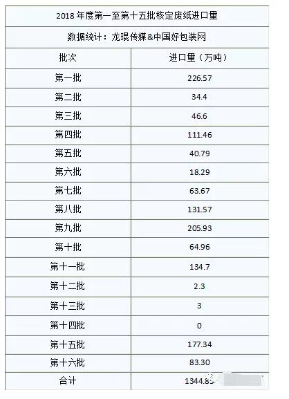 截止目前,2018年一共審批了16批建議批準(zhǔn)的限制進(jìn)口類(lèi)申請(qǐng)明細(xì)表,總核定廢紙進(jìn)口量為1344.85萬(wàn)噸。具體如下: