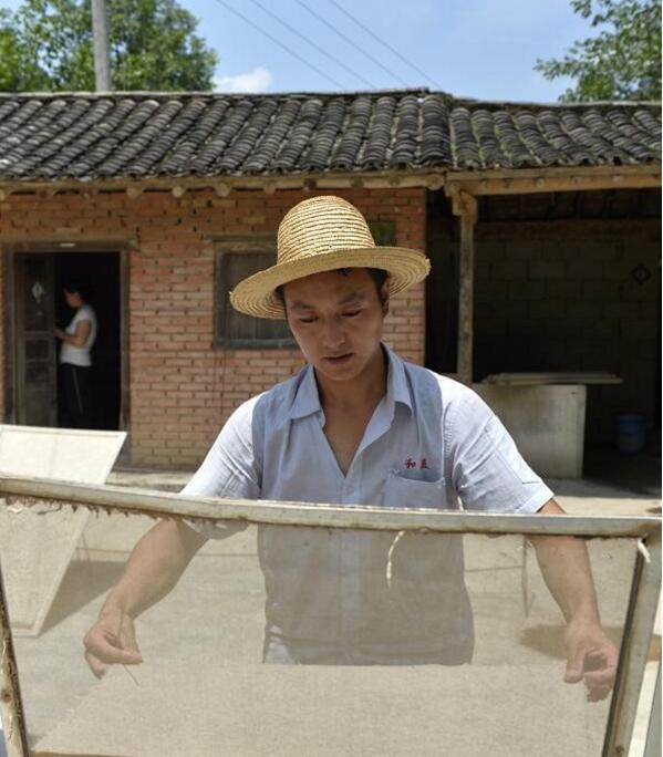 7月22日,“西和手工麻紙”傳承人劉小波撕下晾曬好的麻紙。新華社記者李笑攝