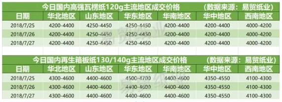 瓦楞箱板上漲行情回顧綜述 7月21至7月27日這一周國內廢舊黃板紙價格保持上漲走勢,漲勢逐漸蔓延。原料價格雖然走高,且供應持續緊張,但需求萎靡不振,下游訂單好轉跡象一般,無力支撐原紙價格推漲,因而這一周多數紙企報價回穩。其中,西南地區因7月20日重慶玖龍下調瓦楞紙價格150元/噸,周邊中小紙企小幅跟跌,區內成交價格下滑100元/噸左右。華東和華中地區產能集中,近期紙企庫存壓力逐漸增大,上周也有小幅下滑50元/噸表現,整體交投氛圍不佳。 7月21至7月27日這一周國內廢舊黃板紙價格保持上揚走勢,受中美貿易商戰影響箱板紙出貨較差,且據貿易商消息稱,本月有不少進口?埖截洠瑢ο浒寮埵袌鰶_擊較為明顯,從而導致本周北方順發和琥珀紙業箱板紙價格均有下調,訂單稍有好轉。另外,華東地區箱板紙出貨較差,部分紙企小幅暗降成交;西南地區跟跌重慶玖龍,均走跌100元/噸。 7月27日紙廠價格一覽: