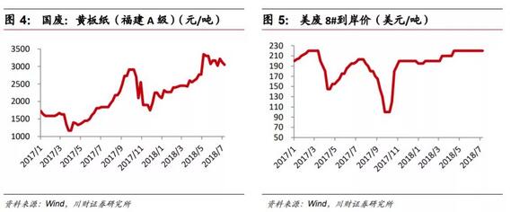 二、人民幣貶值,利好漿價 近期人民幣大幅貶值態勢延續(美元兌美元即期匯率由年初的6.51升至6.83、人民幣累計貶值幅度達4.92%),對造紙等原料進口型企業形成壓力的同時有效支撐內盤木漿價格上行。 8月3日我國國務院再公布第二輪對美加征的關稅反制清單,涉及范圍涵蓋進口木漿的所有種類(其中化學針葉漿、化學闊葉漿均加征關稅5%),推升我國進口紙漿的成本約為5%。預期后續我國內盤漿價仍有上漲空間。 三、東莞玖龍、建暉再領漲廢紙收購價 在供給側改革的驅動下,環保政策趨嚴、外廢配額嚴格限制、檢查形勢趨嚴等多重因素疊加下,廢紙供需失衡導致國廢價格上漲,從而推動下游成品紙價格的上漲。外廢自3月開始上漲,漲幅達20%-50%,國廢價格持續上漲,廢黃板紙和廢純報紙價創近兩年新高,年內漲幅達40.6%和7.8%。