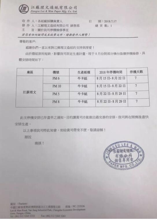 理文廣東、東莞、江蘇、重慶、江西5大基地漲價 8月9日,廣東理文、東莞理文、江蘇理文、重慶理文、江西理文突然對外宣布上調紙價,幅度在100-200元/噸,涉及的紙種暫只有牛卡紙。 據南方一家規模紙板廠透露:以東莞理文為例,8月9日優質牛卡價格上調200元/噸后,牛卡H126g含稅到廠價5935元/噸;H160g含稅到廠價5805元/噸,H200-230g含稅到廠價5755元/噸。 在7月31日的中期業績發布會上,理文造紙首席執行官李文斌談及下半年紙價走勢時就曾釋放漲價信號。他表示,下半年為傳統消費旺季,對公司的產品需求將增加;而國家收緊環保政策則令供應構成壓力,故料下半年整體紙價仍有上升的空間,對公司收益有利。不過,紙價不會無止境地上升,因高昂的紙價或令客戶轉用其他物料代替。 漲價導火索:中方宣布對美廢加征25%關稅 近期由于下游需求無較大起色,包裝紙價格一直低迷。就在8月8日廣東、福建還有好幾家龍頭紙廠降價,周邊部分中小紙企跟跌100-200元/噸,且多數紙廠實單成交時還有優惠。“9號關稅清單一出來,我就猜到要漲價,但沒想到龍頭反應這么快!”多家紙板廠老板在采訪中向華印小編吐槽。 根據他們分析,按照往年慣例,理文造紙應該會選擇在8月中下旬各紙機均從停機檢修中恢復生產后,才會提價。但這次卻剛開始停機幾天,就突然漲價,漲的讓人措手不及,沒有一點點防備。