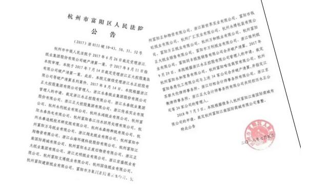 36家公司宣告破產(chǎn) 根據(jù)管理人查明的資產(chǎn)負債情況,永正控股及其關(guān)聯(lián)公司符合企業(yè)破產(chǎn)法破產(chǎn)清算的規(guī)定,富陽法院于2018年6月27日裁定宣告浙江永正控股有限公司、浙江永泰紙業(yè)集團股份有限公司、浙江正大控股集團有限公司、浙江傳承實業(yè)有限公司、杭州永利紙業(yè)有限公司、杭州永鴻紙業(yè)有限公司、杭州富陽永泰熱電有限公司、杭州富陽春江污水回用處理有限公司、杭州永泰造紙技術(shù)研究院有限公司、杭州永森特種紙有限公司、杭州富陽萬馬紙業(yè)有限公司、浙江翔龍紙業(yè)有限公司、杭州富陽中翔物資有限公司、浙江山海環(huán)境科技股份有限公司、杭州富陽永正廢舊物資有限公司、浙江正大紙業(yè)集團有限公司、浙江光明紙業(yè)有限公司、浙江宏盛紙業(yè)有限公司、杭州富陽文博紙業(yè)有限公司、杭州國佳紙業(yè)有限公司、杭州富陽建新紙業(yè)有限公司、富陽市方新廢紙購銷有限公司、杭州富陽正和物資有限公司、浙江新世界實業(yè)有限公司、富陽市錢旺紙業(yè)有限公司、杭州廣匯實業(yè)有限公司、杭州永博包裝有限公司、富陽方正紙業(yè)有限公司、杭州萬和紙業(yè)有限公司、杭州富陽正大紙業(yè)銷售有限公司、富陽市萬利紙業(yè)有限公司、浙江銀利紙業(yè)有限公司、富陽同豐紙張銷售有限公司、杭州富陽永和貿(mào)易有限公司、杭州富陽唯佳商貿(mào)有限公司、杭州富陽春意化工有限公司等36家公司破產(chǎn),并予以公告(見7月9日富陽日報第5版)。