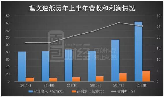 早在此次中期業(yè)績(jī)披露之前,理文造紙的股價(jià)已經(jīng)經(jīng)歷一波大跌:從2018年5月中旬的9.58港元一路跌至7月中旬的6.46港元,2個(gè)月時(shí)間跌幅達(dá)32.57%,隨后股價(jià)才開(kāi)始回調(diào)。 事實(shí)上,可以看到理文造紙的這場(chǎng)大跌趨勢(shì)最早要追溯到2017年的9月中旬,按當(dāng)時(shí)最高復(fù)權(quán)股價(jià)10.71港元來(lái)算,至今年7月中旬已經(jīng)下跌近40%。 那么,理文造紙?jiān)谶@近一年里到底發(fā)生了什么?是什么讓市場(chǎng)對(duì)其靚麗業(yè)績(jī)不買(mǎi)賬?先來(lái)看最新的中報(bào)業(yè)績(jī)。 業(yè)績(jī)速讀:營(yíng)收利潤(rùn)雙雙創(chuàng)新高,毛利率5年來(lái)首次下滑 根據(jù)理文造紙中報(bào)披露,今年上半年共銷(xiāo)售產(chǎn)品295萬(wàn)噸,同比增長(zhǎng)6.5%,每噸利潤(rùn)為1009港元,同比增長(zhǎng)27.4%,紙品利潤(rùn)單價(jià)創(chuàng)下新高。今年上半年,理文造紙的營(yíng)收和凈利潤(rùn)也都創(chuàng)下歷史新高: