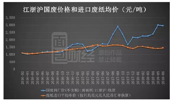 今年上半年,理文造紙營(yíng)收為163.7億港元,同比增長(zhǎng)43.1%;凈利潤(rùn)為29.8億港元,同比增長(zhǎng)35.9%。不僅絕對(duì)值都創(chuàng)新高,同比增幅也都是近五年來(lái)最高。 但是,值得注意的是,理文造紙的中期毛利率卻迎來(lái)2014年以來(lái)的首次下滑:從去年上半年的26.91%降至今年上半年的25.18%,減少了1.73個(gè)百分點(diǎn)。毛利率的下滑,可能正是市場(chǎng)擔(dān)憂的地方。 造紙廠的毛利率主要由兩方面決定:一個(gè)是紙品的出廠價(jià),另一個(gè)是原材料的采購(gòu)價(jià)格。而這兩端的價(jià)格在過(guò)去一年多漲幅迅猛,尤其是原材料價(jià)格的飛漲,讓市場(chǎng)對(duì)其未來(lái)的利潤(rùn)產(chǎn)生擔(dān)憂。而今年美國(guó)掀起貿(mào)易戰(zhàn)后,擔(dān)憂更甚。 美廢價(jià)格將上揚(yáng),國(guó)廢供應(yīng)能否跟上? 近年來(lái)我國(guó)一直在開(kāi)展對(duì)“洋垃圾”的打擊。 2017年8月,相關(guān)文件出臺(tái),將從2017年底開(kāi)始正式禁止進(jìn)口未經(jīng)分揀廢紙。2018年3月,廢紙進(jìn)口新規(guī)正式開(kāi)始實(shí)施,新規(guī)要求申請(qǐng)進(jìn)口廢紙?jiān)S可的企業(yè),年產(chǎn)能需達(dá)到5萬(wàn)噸,且將進(jìn)口廢紙含雜率從1.5%降至0.5%。 在對(duì)進(jìn)口廢紙的多重限制下,國(guó)內(nèi)紙廠將原材料采購(gòu)轉(zhuǎn)向國(guó)廢,但是由于我國(guó)廢紙收購(gòu)體系尚不完善,國(guó)廢的供應(yīng)無(wú)法跟上激增的廢紙需求,從而導(dǎo)致國(guó)廢價(jià)格飆漲,而進(jìn)口廢紙因需求關(guān)系價(jià)格有所回落。根據(jù)wind的原始數(shù)據(jù),面包財(cái)經(jīng)進(jìn)行了適當(dāng)?shù)挠?jì)算,國(guó)廢和進(jìn)口廢紙價(jià)格走勢(shì)如下圖: