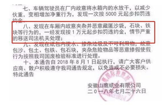 想要繼續(xù)擴(kuò)大自己的打包站的用戶可以考慮多一些投入在前期挑揀上,假設(shè)A級(jí)紙是2900元/噸,B級(jí)紙2800元/噸,一車就是幾千的差距~ 三、紙廠分類我們,我們也分類紙廠 行走廢紙江湖,必須得有一個(gè)清晰的思路和一套有序的“行業(yè)經(jīng)”來作為自己屹立不倒的必殺技。 在紙品定級(jí)與扣點(diǎn)上,不同紙廠是不一樣的,這其中為廢紙打包站帶來的利潤(rùn)是很誘人的。正因此紙廠驗(yàn)收的時(shí)候也是會(huì)將我們分為三六九等的,A某總是賣水分很重的紙,B某家的紙總是離一級(jí)黃板差那么點(diǎn)意思,但是挺干凈,諸如此類,打包站和紙廠是長(zhǎng)久合作的,打一槍換一個(gè)地方不利于打包站長(zhǎng)久發(fā)展。 這時(shí)回過頭看看自己擴(kuò)充的紙廠資源,掌握了紙廠的各項(xiàng)規(guī)則,做一個(gè)分類,例如調(diào)價(jià)比較跳的森林等;驗(yàn)收標(biāo)準(zhǔn)上,有的廠對(duì)統(tǒng)貨要求是黃板紙含量在50%以上,有的廠黃板紙和灰黃板含量≥20%,允許雜紙含量80%以內(nèi)等等。自然就會(huì)發(fā)現(xiàn)合適的銷路,不過這里需要注意平衡一下運(yùn)費(fèi)來控制利潤(rùn)。 給玖龍送貨容易嗎?又出裝車規(guī)范了,打包站老板要注意啦! 上周,玖龍發(fā)通知對(duì)到貨要求及違規(guī)防水的做出嚴(yán)格規(guī)定。今日又收到東莞玖龍對(duì)裝車要求的規(guī)定,最高加扣4%,F(xiàn)在打包站給玖龍送貨越來越嚴(yán)格了,各打包站老板要注意啦! 東莞玖龍 【東莞玖龍】各位供應(yīng)商,你們好,為提高國(guó)廢進(jìn)廠卸貨效率,特通知如下: 1.裝車要求規(guī)范(具體看告知函及圖片),不合要求須調(diào)整紙包,收費(fèi)標(biāo)準(zhǔn)20元/噸 2.進(jìn)廠前所有紙包須貼填寫好的綠色標(biāo)簽,未貼標(biāo)簽或者粘貼不全的在原有扣點(diǎn)基礎(chǔ)上加扣2%;如發(fā)現(xiàn)在廠區(qū)貼標(biāo)簽,加扣4%。 送貨東莞玖龍注意事項(xiàng): 1.裝車規(guī)范: 1)、裝車后紙包的最低處到紙包最高處必須超過1.8米(純廢紙的高度),上下層寬度保持一致,不能有缺包現(xiàn)象存在。 2)、請(qǐng)不要選用車板面高度與地面距離低于1.2米的車輛。 3)、不要使用裝載廢紙量低于10噸的車輛送貨到我司。 4)、裝車包與包之間不能存有可視空隙,紙包不能交叉裝車,大小包不能混裝。 注:如發(fā)現(xiàn)有任何一點(diǎn)不符合以上要求的,該車廢紙?jiān)谠惺召弮r(jià)格基礎(chǔ)上降20元/噸進(jìn)行結(jié)算。 2.國(guó)廢紙包標(biāo)簽粘貼:送我司的所有廢紙包必須粘貼標(biāo)簽,進(jìn)廠前每包紙包必須粘貼完畢,未貼標(biāo)簽或者粘貼不全的在原有扣點(diǎn)基礎(chǔ)上加扣2%,如有發(fā)現(xiàn)在我司廠區(qū)內(nèi)粘貼標(biāo)簽的,在原有檢測(cè)基礎(chǔ)上加扣4%。 標(biāo)簽可自行印刷,尺寸不得小于7CM*7CM,顏色為綠色、藍(lán)色等具有明顯標(biāo)識(shí)的不干膠紙。 以上規(guī)定從2018年8月20日起,現(xiàn)場(chǎng)會(huì)嚴(yán)格按照此規(guī)定執(zhí)行,近期請(qǐng)通知供應(yīng)商做好通知落實(shí)。