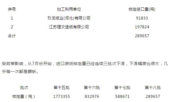8月20日,環保部固體廢物與化學品管理技術中心公示了今年第18批限制進口類產品明細,僅有玖龍紙業(河北)有限公司、江蘇理文造紙有限公司和浙江山鷹紙業有限公司3家造紙企業獲批,其中浙江山鷹紙業是之前批次更換口岸。