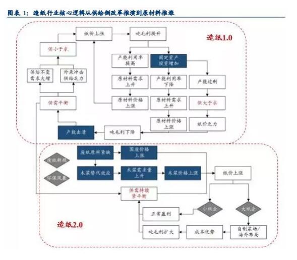 廢紙進(jìn)口政策推動(dòng)造紙行業(yè)新變,核心邏輯從供給側(cè)改革推演到原材料推漲:2017年行業(yè)的邊際變化發(fā)生在原材料端,隨著進(jìn)口廢紙政策趨嚴(yán),一方面國廢價(jià)格飆升,另一方面因?yàn)樘娲饔脤?dǎo)致木漿需求緊俏,原材料在行業(yè)中的重要性凸顯。我們對(duì)新的造紙研究框架進(jìn)行了梳理,造紙行業(yè)從1.0時(shí)代步入2.0時(shí)代。造紙行業(yè)的新邏輯不是簡(jiǎn)單供需結(jié)構(gòu)再變化,而是基于供需結(jié)構(gòu)緊平衡延續(xù)下原材料的緊俏,原材料價(jià)格向上推動(dòng)紙價(jià)上漲。 原材料緊缺成行業(yè)主線,供需穩(wěn)定原材料推漲紙價(jià) 供環(huán)保持續(xù)限制新增產(chǎn)能投放,行業(yè)供需狀態(tài)持續(xù)偏緊,2017年下半年以來隨著廢紙進(jìn)口政策的逐漸加碼,原材料成為行業(yè)核心關(guān)鍵因素:由于廢紙新政和環(huán)保限制,行業(yè)原材料端發(fā)生變化: (1)廢紙材料緊缺:外廢進(jìn)口量大幅下降,無法通過大量提升國廢回收量進(jìn)行補(bǔ)充,廢紙?jiān)牧暇o張; (2)木漿替代效應(yīng)凸顯:外廢進(jìn)口量縮減,2017年全年生產(chǎn)箱板紙耗用的木漿量為280萬噸,較2016年增加140萬噸。紙企因廢紙緊缺轉(zhuǎn)而使用部分木漿替代,木漿需求量較大增加,從而廢紙、木漿原材料價(jià)格雙雙上漲。在供需緊平衡前提下,原材料上漲的向下傳導(dǎo)是行業(yè)旺季的紙價(jià)支撐。 今年1-3月受廢紙新規(guī)刺激補(bǔ)庫存,4-6月淡季緩慢去庫存,7月紙廠主動(dòng)備庫存。今年4-6月紙價(jià)持續(xù)調(diào)整與行業(yè)慣例不同,年初廢紙新規(guī)出臺(tái),加劇市場(chǎng)對(duì)原材料緊張情緒。2-3月份青島港、保定港木漿庫存達(dá)到峰值71萬噸、8萬噸,紙廠廢黃板紙庫存天數(shù)為8天,箱板紙、瓦楞紙企業(yè)庫存分別為107萬噸、59萬噸。4月-6月為傳統(tǒng)出貨淡季,期間行業(yè)緩慢去庫存,6月青島港木漿、保定港木漿庫存下降至45萬噸、7萬噸,紙廠廢黃板紙庫存天數(shù)為9天,箱板紙、瓦楞紙企業(yè)庫存分別95萬噸、57萬噸。7月份庫存有所恢復(fù),系傳統(tǒng)旺季紙價(jià)上漲預(yù)期,紙廠備庫存開始,青島港、保定港木漿庫存分別為52萬噸、8萬噸,紙廠廢黃板紙庫存天數(shù)為6天,箱板紙、瓦楞紙企業(yè)庫存分別為123萬噸、69萬噸。