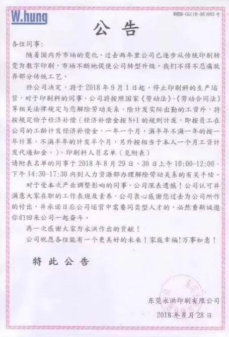 9月1日停止印刷科的生產運營,所有同事將解除勞動關系 ”自2018年9月1日起,東莞永洪印刷有限公司將停止印刷科的生產運營,所有印刷科同事將解除勞動關系。”2018年8月28日,東莞永洪印刷有限公司向內部發(fā)布了這份公告: