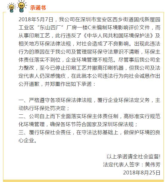 深圳市乙方紙品包裝有限公司環保公開道歉承諾書