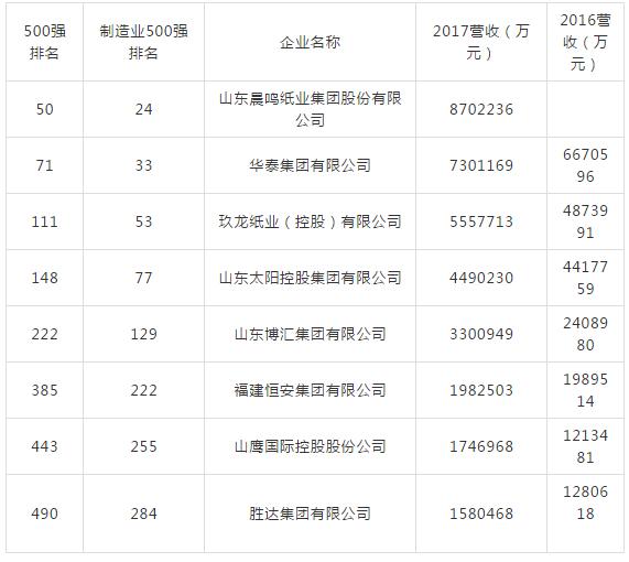 共有8家造紙企業進入了民營企業500強和民營制造業企業500強榜單,山東晨鳴紙業以8702236萬元的營收排名總榜單第50位,造紙行業第一位。華泰集團、玖龍紙業、太陽控股、博匯集團、恒安集團、山鷹國際和勝達集團依次列后。 晨鳴紙業的入選比較意外,晨鳴紙業的實際大股東是壽光市國資委,過去一直以國有企業的身份出現在各種評選中,這次是晨鳴紙業第一次以民營企業的身份參加工商聯的評選。  2018年《財富》中國500強發布,造紙行業6家公司上榜 需要注意的是,財富中文網于北京時間2018年7月10日發布了最新的《財富》中國500強排行榜。該榜單由《財富》(中文版)與中金公司財富管理部合作編制,考量了全球范圍內最大的中國上市企業在過去一年的業績和成就。 今年中國500家上榜的上市公司總營業收入達到了39.65萬億元人民幣,較去年上漲18.22%,漲幅翻倍;凈利潤更是達到了3.48萬億元,增長24.24%(作為對比,去年凈利潤漲幅僅為2.2%)。今年上榜公司的年營收門檻為138.64億元,繼去年首次突破百億之后,提升了22.44%。 今年一共有47家新上榜和重新上榜公司,頗受關注的是造紙行業此次有6家公司上榜。在供給側改革推進、環保要求趨嚴、國際油價上行等因素的影響下,"漲價板塊"在2018年的榜單中多點開花,中上游行業明顯受益。造紙行業6家上榜公司,2017年累計收入同比增長29.1%,累計歸母凈利潤增速高達87.9%。 下面是這六家造紙企業的排名、營收以及公司基本情況介紹。 1、玖龍紙業(控股)有限公司 排名:170上年排名:182營業收入:45679.23百萬元