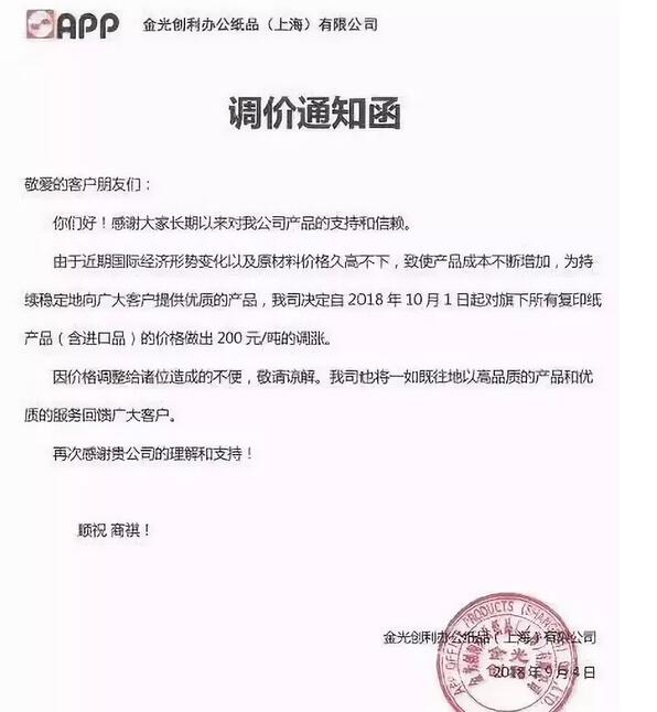 旺季來臨,各紙種價格上漲成了普遍現(xiàn)象! 9月1日起,全國部分文化紙企業(yè)掀起了新一輪調價潮。事實上,從8月22日到8月31日的10天內,近30家紙廠已經發(fā)布漲價函,漲幅為200-300元/噸。 受此影響,終端紙類文具已經調價。和上半年相比,作業(yè)本、筆記本等紙類文具用品出現(xiàn)了10%-20%的上漲。 經濟導報記者在調查中了解到,成品紙價格上漲的主要因素是受原材料價格上漲、匯率變化影響。受訪人士認為,短期內,隨著市場步入旺季,供需關系發(fā)生變化,加上外廢進口進一步趨嚴,木漿加征關稅,導致紙企提高紙價。 一、央視聚焦紙價上漲,只因漲價函頻繁現(xiàn)身 造紙行業(yè)2018年上半年整體維持了高景氣度,各紙種價格上漲了10-15%,而原材料廢紙、闊葉漿、針葉漿價格分別同比上漲69%、31%、40%。近期,央視再度關注紙價上漲,將行業(yè)推向了風口浪尖。 據(jù)報道,隨著原材料價格的上漲,疊加需求旺季等因素,龍頭紙企的漲價函更不含糊。 APP,自10月1日起,所有復印紙產品(含進口品)價格上調200元/噸。