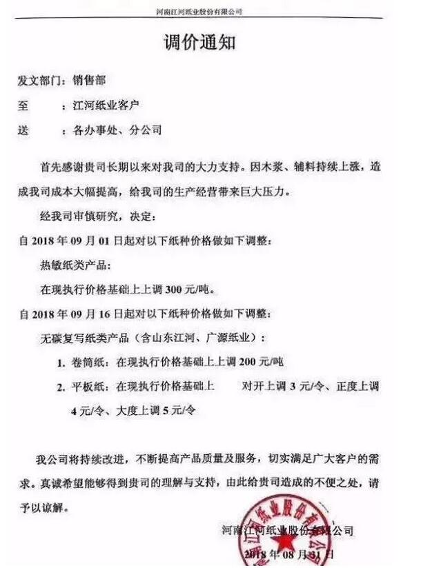江河紙業(yè),自9月1日起,熱敏紙產品價格上調300元/噸。自9月16日起,無碳復寫紙產品,卷筒價格上調200元/噸,平板對開上調3元/令、正度上調4元/令、大度上調5元/令。