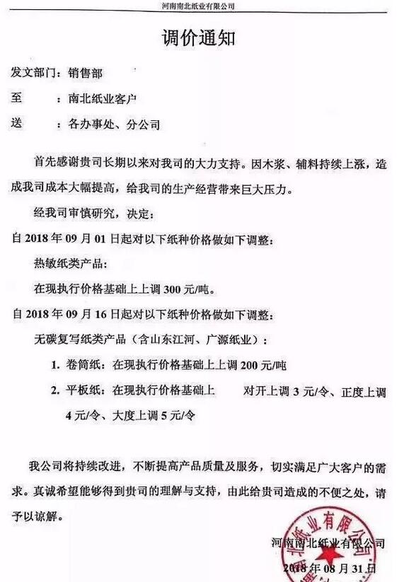 南北紙業(yè),自9月1日起,熱敏紙產品價格上調300元/噸。自9月16日起,無碳復寫紙產品,卷筒價格上調200元/噸,平板對開上調3元/令、正度上調4元/令、大度上調5元/令。