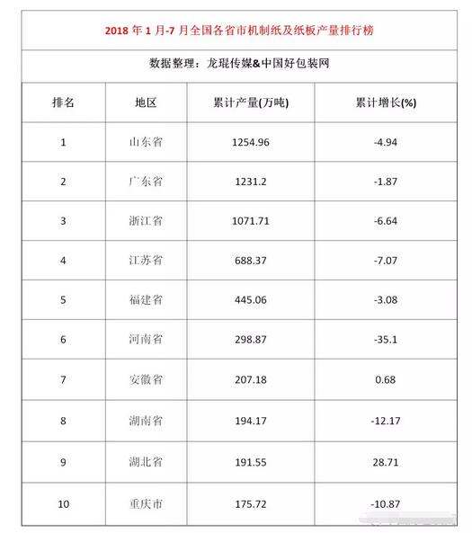 2018年第四季度已經到來,有業內人士認為,目前淘寶天貓雙十一活動規則正式公布,商家正進入統籌備貨的時候,旺季也將逐步開啟。那么,在進入旺季之前,目前的紙品包裝產業鏈的行情是怎樣的呢? 為此,筆者通過國家統計局查詢到了2018年1-7月份的全國機制紙及紙板產量,發現其產量為6923.3萬噸,變化幅度不大,同比下降0.9%。同時,筆者還查詢到了9月3日-4日,包括玖龍在內的全國14家紙廠的報價情況,以供大家參考! 1-7月份,全國機制紙及紙板產量為6923.3萬噸,河南省同比下滑35.1% 國家統計局數據顯示,1-7月份,全國機制紙及紙板產量為6923.3萬噸,同比下降0.9%。前十省市分別是山東省、廣東省、浙江省、江蘇省、福建省、河南省、安徽省、湖南省、湖北省和重慶市。 其中,山東省、廣東省、浙江省三大省份1-7月份累計產量均達到了1000萬噸以上,分別為1254.96萬噸、1231.2萬噸、1071.71萬噸,明顯高于其余七家省市一個層級。