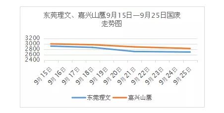每到中秋佳節,都是家人歡聚一堂的的時刻,而遠在異鄉的人唯有與明月對影三人。美好的事物下總是勾起失意人的惆悵,文人騷客總是借此懷古傷今,表達心中悲苦。今年中秋時期的國廢沒能逃此厄運,即使不少廠家選擇了放假停收,整體市場仍是一蹶不振。 在中秋前的一個禮拜,國廢價格已是一瀉千里,有些廠家一天內甚至多次下調。我們以東莞理文和嘉興山鷹為例,如下圖。兩家中秋節前一個禮拜黃板紙A級均在3000左右,在此之后不斷下跌,截至中秋節后第一天其價格已跌去接近200。