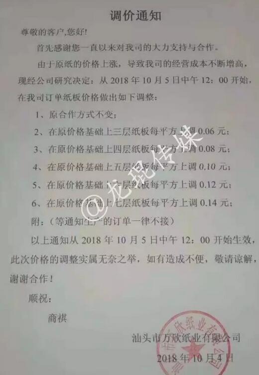 汕頭市萬騰紙品實業有限公司:從2018年10月5日8點起,二層紙板價格每平方上調0.04元;三層紙板價格每平方上調0.06元;四層紙板價格每平方上調0.08元;五層紙板價格每平方上調0.10元;六層紙板價格每平方上調0.12元;七層紙板價格每平方上調0.14元。等通知生產的訂單一律不接。