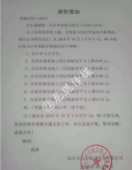 汕頭市萬豐紙品實業有限公司:從2018年10月5日中午12點起,兩層紙板價格每平方上調0.04元;三層紙板價格每平方上調0.06元;四層紙板價格每平方上調0.08元;五層紙板價格每平方上調0.10元;六層紙板價格每平方上調0.12元;七層紙板價格每平方上調0.14元。等通知生產的訂單一律不接。