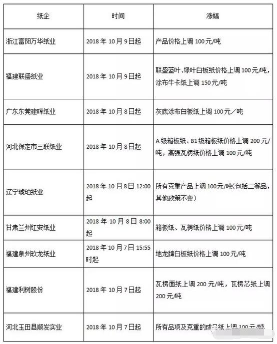 10月7日-9日,玖龍、聯(lián)盛領(lǐng)銜紙價上漲 10月初,原紙價格出現(xiàn)小規(guī)模的上漲:山鷹紙業(yè)提價200元/噸,浙江、福建等地部分紙廠跟進(jìn)上調(diào)。隨著國慶假期的結(jié)束,造紙廠陸續(xù)開工復(fù)產(chǎn),紙價喊漲之聲逐漸蔓延開來。 10月7日-9日,在此期間漲價的紙廠數(shù)量明顯增加,其中不乏大型紙廠,如泉州玖龍上調(diào)地龍牌白板紙100元/噸、福建聯(lián)盛上調(diào)藍(lán)葉、綠葉白板紙100元/噸。