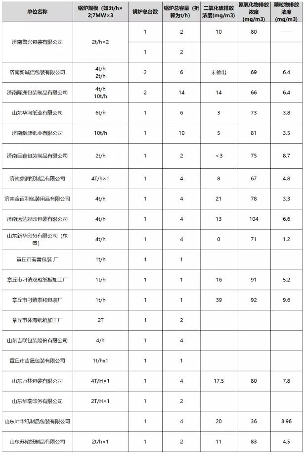 根據濟南市環保局要求,濟南市燃氣鍋爐低氮改造和生物質鍋爐超低排放改造的截止日期是2019年10月底,環保局所羅列出的全市鍋爐排查情況表中包含的企業,有20家包裝廠,其排放標準不符合要求的,需按要求按標準在規定時間內完成改造任務。 山東濟南市鍋爐改造標準和時間定了! 8月底,濟南環保局發布《關于加快推進全市鍋爐深度治理有關工作的通知》(以下簡稱“通知”),10月9日,濟南環保局再發布《關于加快推進全市鍋爐深度治理有關工作的補充通知》,對8月份發布的內容作了補充。根據兩次發布的通知要求,濟南市燃氣鍋爐低氮改造和生物質鍋爐超低排放改造的截止日期是2019年10月底,環保局所羅列出的全市鍋爐排查情況表中包含的企業,需按要求按標準在規定時間內完成改造任務。 改造時間 濟南市燃氣鍋爐低氮改造和生物質鍋爐超低排放改造完成時間適當放寬,力爭2019年6月底完成,對因承擔供暖(制冷)等保障民生或涉及爐膛改造等工藝復雜的鍋爐,確有實際困難的,完成時間可延長至2019年10月底。 改造標準 按照《秋冬季攻堅方案》的要求,燃氣鍋爐低氮改造后,原則上氮氧化物排放濃度不高于50毫克/立方米,鼓勵按照30毫克/立方米進行改造。 生物質鍋爐超低排放改造標準。按照《京津冀及周邊地區2018-2019年秋冬季大氣污染綜合治理攻堅行動方案》(征求意見稿)要求,生物質鍋爐超低排放改造后,應達到燃煤電廠超低排放水平。其中煙塵、二氧化硫、氮氧化物濃度限值分別為10、35、50毫克/立方米(現有W型火焰爐膛鍋爐和循環流化床鍋爐氮氧化物為100毫克/立方米)。 采樣平臺和采樣孔規范化建設標準。按照山東省《固定污染源廢氣低濃度排放監測技術規范》(DB37/T2706-2015)要求,規范建設采樣平臺和采樣孔。 時間安排 2018年10月底前,對照《濟南市燃氣鍋爐排查情況匯總表》和《濟南市生物質鍋爐排查情況匯總表》,完成清單信息核查、計劃制定工作;2019年5月底前完成組織實施工作;2019年6月底完成驗收工作(因承擔供暖等停用不具備驗收條件的,可于2019年11月底前完成驗收工作)。 19家包裝廠鍋爐未達標,最晚明年10月底前改造完畢 根據濟南市環保局給出的全是鍋爐排查情況表,瓦小編整理發現,有20家包裝企業在內,對比環保局要求的燃氣鍋爐的氮氧化物排放濃度原則上不高于50毫克/立方米,有19家企業的排放濃度都不符合該標準,這就意味著最晚在2019年10月底,這些企業需要按要求對燃氣鍋爐改造完畢。 濟南市燃氣鍋爐排查情況匯總表