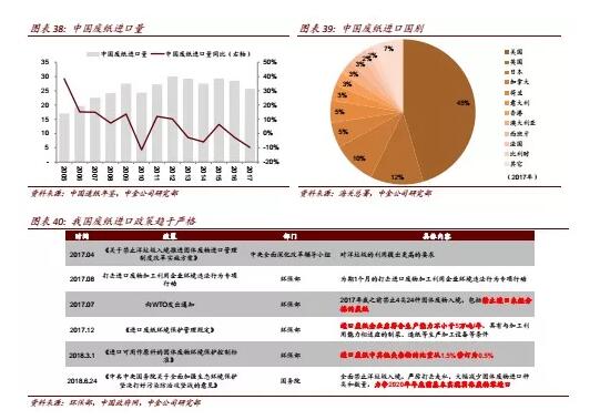 2017年中國共進口廢紙2,572萬噸,同比下降9.8%,進口廢紙主要來自美國、英國、日本,占比分別達到45%、12%、10%。預計2018年廢紙進口量將繼續下滑至2,000萬噸左右,同比下降約22%。 原因其一在于當前我國整體廢紙進口收緊,禁止混雜廢紙進口將影響約500萬噸進口量,含雜率標準降低也將提升進口難度。 其二在于2018年中美貿易摩擦加劇,當前我國對美廢進口加征25%關稅,也令美廢的進口價格優勢大幅縮小,進而影響總量及進口國別結構。向前看,根據20186月國務院發布的《中共中央國務院關于全面加強生態環境保護堅決打好污染防治攻堅戰的意見》,我國將力爭2020年年底前基本實現固體廢物零進口,故我們預計未來兩年我國廢紙進口收緊趨勢不變,進口量將繼續快速下降。
