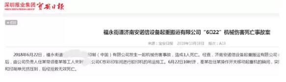 廣東:知名印刷廠發(fā)生機(jī)械死亡事故,被安監(jiān)局調(diào)查 據(jù)寶安日?qǐng)?bào)2018年10月18日?qǐng)?bào)道,因廣東某知名印刷公司發(fā)生一起機(jī)械死亡事故,引起了廣東省深圳市寶安區(qū)安監(jiān)局的高度重視。經(jīng)調(diào)查取證,最終于2018年9月11日對(duì)承接該印刷公司設(shè)備吊裝作業(yè)的搬運(yùn)公司處以罰款22萬元。 雖然這次這家包裝印刷公司沒有遭受罰款,但在業(yè)內(nèi)的名譽(yù)卻受到了損失。一些業(yè)內(nèi)同行得知該廠安全事故頻發(fā)后,質(zhì)疑其公司管理能力,甚至是不愿讓同行去該廠打工。 事情經(jīng)過:2018年6月22日,福永街道XX印刷(中國(guó))有限公司發(fā)生一起機(jī)械傷害事故,造成1人死亡。經(jīng)查,濟(jì)南安諾信設(shè)備起重搬運(yùn)有限公司(以下簡(jiǎn)稱“安諾信公司”),承接設(shè)備吊裝作業(yè)后,由公司負(fù)責(zé)人任某帶領(lǐng)秦某等工人來到XX印刷公司C棟彩印車間進(jìn)行膠印機(jī)的吊運(yùn)施工。6月22日10時(shí)許,秦某在任某操作開關(guān)移動(dòng)起重機(jī)的瞬間,突然從印刷單元上站起來,導(dǎo)致其頸部被移動(dòng)的橫梁和印刷單元擠壓到,后經(jīng)搶救無效死亡。 經(jīng)事故調(diào)查組調(diào)查并經(jīng)區(qū)政府批復(fù),認(rèn)定造成事故發(fā)生的直接原因?yàn)楣と饲啬嘲踩庾R(shí)淡薄,在未告知現(xiàn)場(chǎng)管理人員的情況下私自蹲在印刷單元上進(jìn)行吊具拆除作業(yè),在未確認(rèn)安全的情況下突然站立,導(dǎo)致其頸部被移動(dòng)的橫梁和印刷單元夾到而死亡。間接原因?yàn)榘仓Z信公司安全管理不到位,未對(duì)秦某進(jìn)行安全教育和培訓(xùn),且未制定涉事設(shè)備的安全操作規(guī)程,未告知工人工作場(chǎng)所存在的危險(xiǎn)因素和防范措施。根據(jù)上述查明事實(shí),依據(jù)《中華人民共和國(guó)安全生產(chǎn)法》第二十五條、第四十一條和第一百零九條第(一)項(xiàng)的規(guī)定,區(qū)安監(jiān)局于2018年9月11日對(duì)該公司處罰款22萬元。 寶安區(qū)安監(jiān)局提示:安全操作規(guī)程是指在生產(chǎn)活動(dòng)中,為消除導(dǎo)致人身傷亡或者造成設(shè)備、財(cái)產(chǎn)破壞以及危害環(huán)境的因素而制定的具有技術(shù)要求和實(shí)施程序的統(tǒng)一規(guī)定。安全操作規(guī)程是保證生產(chǎn)經(jīng)營(yíng)活動(dòng)安全進(jìn)行的重要制度保障,從業(yè)人員在進(jìn)行作業(yè)時(shí)必須嚴(yán)格遵守。從事操作機(jī)械作業(yè)的生產(chǎn)經(jīng)營(yíng)單位應(yīng)當(dāng)加強(qiáng)員工的安全生產(chǎn)教育和培訓(xùn)工作,增強(qiáng)員工的安全意識(shí),制定員工操作機(jī)械的安全操作規(guī)程,告知員工操作機(jī)械可能存在的危險(xiǎn)因素以及相關(guān)的防范措施。