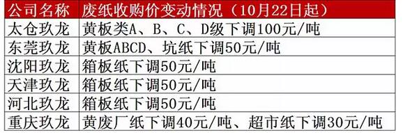 △2018年10月22日玖龍六大基地齊降廢紙收購價,降幅30-100元/噸。 廣東紙廠反應迅速,行業大哥東莞玖龍率先做出表率,成品紙價格最高優惠200元/噸。據華印小編了解,東莞玖龍從2018年10月20日起下調包裝紙報價。其中,牛卡芯紙優惠(下調)200元/噸,白板紙優惠(下調)100元/噸。隨后,潮州市弘和紙品有限公司也向客戶發出了降價函,宣布自2018年10月20日出貨起,對所有普通瓦楞紙在原有價格基礎上下調200元/噸。 作為行業龍頭企業,玖龍向來被看做行業價格風向標,其自身也對價格調節也十分慎重。然這已是近1個月玖龍第三次降價(期間也有過漲價)。9月20日,東莞玖龍下調牛卡200元/噸、下調高瓦150元/噸。9月30日至10月7日期間,玖牛、海牛優惠400元/噸,地牛、地再、白面、涂布優惠350元/噸,玖芯50-70克優惠350元/噸,其他芯紙優惠400元/噸,白板紙優惠200元/噸。 瓦楞紙價連續10周下跌,近5個月已跌近1000元/噸 瓦楞紙一向被稱為紙業“晴雨表”,其價格變動往往領先于其他紙種。然而在國家統計局對瓦楞紙(高強)全國市場價的監控中,瓦楞紙(高強)已經連續10周下跌,在產業旺季,價格卻接近年內低點。目前其最新價格為4099元/噸,與5月底5089元/噸的價格高點相比,每噸已經跌價近1000元。
