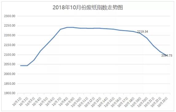 (數據來源:紙去哪了數據中心) 由上圖顯示,10月18日,也就是本次外廢(第二十二批)到來的時候,廢紙大盤指數在10月份來說并不算最高點,但是也是處于一個穩定階段的末尾,本次外廢消息公示后,玖龍、理文等各大基地帶給市場的掉價由10月18日的2219.34掉到了10月23日(數據統計至昨日)2094.73,指數跌幅為-124.61。 由此可見,本次外廢進口導致大型紙企在一段時間內并不需要國廢的供應,致使廢紙市場下滑。 今年來看,市場的頻繁下滑加上“廢紙劫”的提前導致年末的市場沒有得到一個提升,小編看來,國廢的價格市場供大于求會導致市場長期得不到一個穩定的高位。
