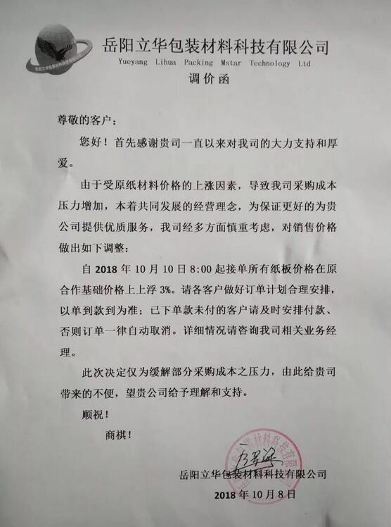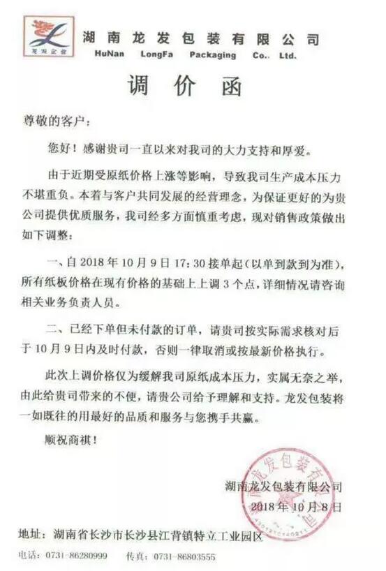 10月超20家紙企漲50-200元/噸,紙企集中停機后傳統漲價“套路”? 國慶節過后不久,玖龍、聯盛、山鷹三大巨頭齊齊漲價的消息蜂擁而至。在此之前,浙江省永嘉縣穗豐紙業、福建華發紙業、山鷹紙業等企業已接連調價,對瓦楞紙、T紙、紅杉?埖鹊膬r格上調了200元/噸。 而后多個紙業公司發出漲價通知,到10月15日,加上當天調價的杭州金泰紙業有限公司在內,短短半個月的時間,已有超過20家造紙企業加入了漲價的行列,幅度在50-200元/噸不等。 10月部分紙企漲價函: