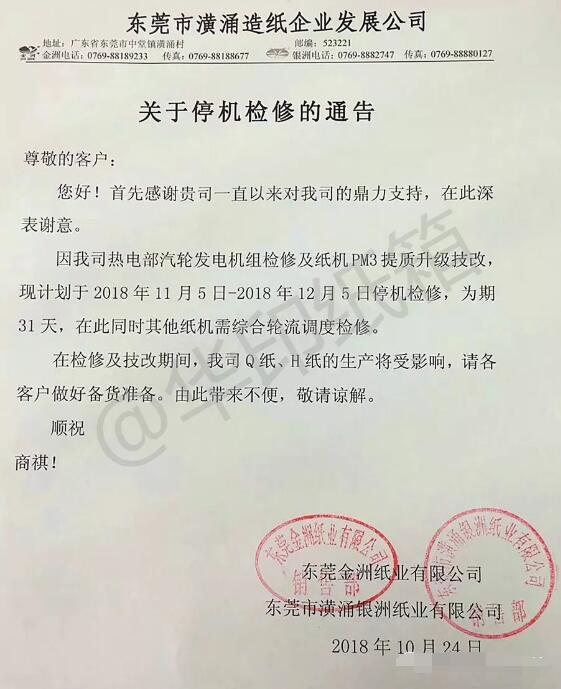 2018年10月24日,東莞金洲紙業(yè)有限公司、東莞市潢涌銀洲紙業(yè)有限公司向客戶發(fā)出關(guān)于停機(jī)檢修的通告: