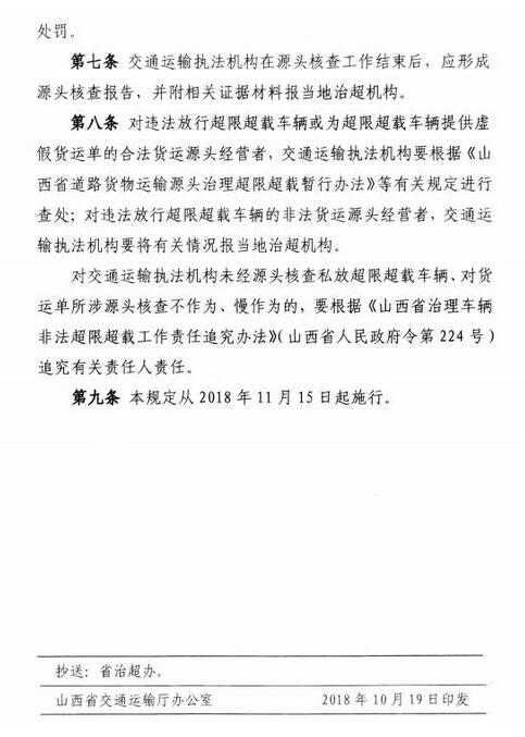 第六條 交通運輸執(zhí)法機構要根據當地治超機構所提供的貨運單對涉及的貨運源頭經營者進行核查,并按有關法律法規(guī)進行處罰。 第七條 交通運輸執(zhí)法機構在源頭核查工作結束后,應形成源頭核查報告,并附相關證據材料報當地治超機構。 第八條 對違法放行超限超載車輛或為超限超載車輛提供虛假貨運單的合法貨運源頭經營者,交通運輸執(zhí)法機構要根據《山西省道路貨物運輸源頭治理超限超載暫行辦法》等有關規(guī)定進行查處; 對違法放行超限超載車輛的非法貨運源頭經營者,交通運輸執(zhí)法機構要將有關情況報當地治超機構。 對交通運輸執(zhí)法機構未經源頭核查私放超限超載車輛、對貨運單所涉源頭核查不作為、慢作為的,要根據《山西省治理車輛非法超限超載工作責任追究辦法》(山西省人民政府令第224號)追究有關責任人責任。 第九條 本規(guī)定從2018年11月15日起施行。
