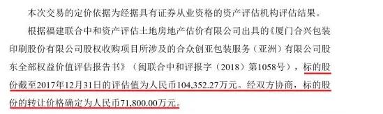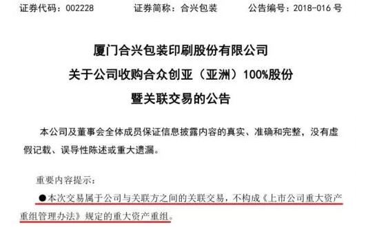 ▲來源:公司公告 在總量6.50億元的并購基金中,合興包裝出資1.17億元,持股18%。這意味著,合興雖然還是收購的主導(dǎo)者,但運作卻轉(zhuǎn)到了上市公司之外。這樣一來,對架橋合興的持股比例不屬于實控人,自然不必并入母公司報表,而合興包裝欲收購的國際紙業(yè)的這批紙箱廠自然可以放心通過架橋合興100%持有。 接下來的進展迅捷而高效。2016年3月14日,架橋合興與國際紙業(yè)簽署《股份轉(zhuǎn)讓協(xié)議》,以6.25億元的價格吃進后者位于中國和東南亞的18家瓦楞紙箱廠,同時承諾由相關(guān)企業(yè)在約定時間內(nèi)償還所欠國際紙業(yè)約3億元的貸款。 至此,國際紙業(yè)的相關(guān)資產(chǎn),已經(jīng)在事實上處于合興的控制之下。 值得注意的是另一方面也顯示,這批紙箱廠處于虧損狀態(tài),從2010年2億美元買進到2016年以6.25億元的價格賣出,國際紙業(yè)持有這批紙箱廠滿打滿算不到6年。而且,一買一賣之間,至少虧掉幾億元。 時間回到現(xiàn)在,根據(jù)公告,公司擬收購的合眾創(chuàng)亞包裝服務(wù)(亞洲)有限公司的財務(wù)報表非常耀眼,最近兩年及一期,標(biāo)的公司營業(yè)收入分別為166346.43萬元、217182.13萬元和117031.89萬元。營業(yè)利潤分別為2174.01萬元、8228.07萬元和4392.88萬元。凈利潤分別為1535.67萬元、6473.11萬元和3390.95萬元。 公司養(yǎng)肥了,然后就開始收割了,因為標(biāo)的資產(chǎn)盈利能力大幅提高,根據(jù)公司的評估計算,估值變?yōu)?0.44億,也就出現(xiàn)了開頭與架橋合興并購,靠會計算法虛增利潤的那一幕。 然而當(dāng)以為這就結(jié)束的時候,合興包裝又有新動作了。 開啟收割模式 合興包裝并購的合眾創(chuàng)亞包裝服務(wù)(亞洲)有限公司僅為當(dāng)時架橋合興旗下的一家公司而已。養(yǎng)肥之后并入合興包裝之后,合興包裝的總資產(chǎn)的增長速度也是插上了想象的翅膀。2018年上半年直接到達(dá)70.47億元。