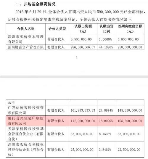 ▲來源:公司公告 2016年2月16日合興包裝一手扶持的并購基金架橋合興應(yīng)運而生。