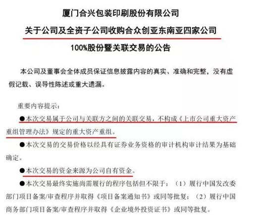 ▲來源:公司公告 合興包裝公司擬以自有資金,收購架橋合興持有合眾創(chuàng)亞(柔佛)100%股份、合眾創(chuàng)亞(吉隆坡)100%股份、合眾創(chuàng)亞(印尼)99.90%股份及合眾創(chuàng)亞(泰國)99.998%股份,自然人周勤持有合眾創(chuàng)亞(印尼)0.1%股份、合眾創(chuàng)亞(泰國)0.001%股份,自然人許海天持有合眾創(chuàng)亞(泰國)0.001%股份。 四家目標(biāo)公司經(jīng)審計凈資產(chǎn)合計數(shù)為563.52萬元,經(jīng)各方協(xié)商一致,四家目標(biāo)公司100%股份的轉(zhuǎn)讓價格根據(jù)四家目標(biāo)公司經(jīng)審計凈資產(chǎn)合計數(shù)取整最終確定為560萬元。雖然不及合眾創(chuàng)亞包裝服務(wù)(亞洲)有限公司的并購資產(chǎn)耀眼,但是合興包裝的這把并購游戲是玩定了。