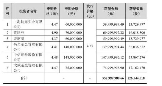 ▲來源:公司公告 而當(dāng)時認(rèn)購的為上海鈞犀實業(yè)有限公司、黃國典、許麗明、興全基金管理有限公司、中信證券股份有限公司、大成基金管理有限公司。